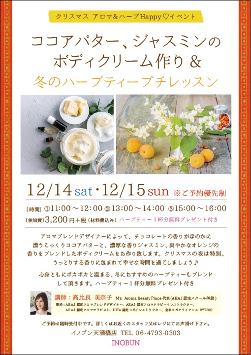 第21回イノブン天満橋店でのアロマ講座「ココアバター、ジャスミンのボディクリーム作り&冬のハーブティープチレッスン」開催のご案内
